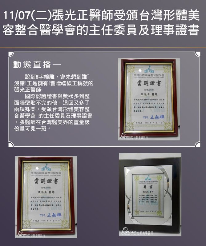 张光正医师受颁台湾形体美容整合医学会的主任委员及理事证书