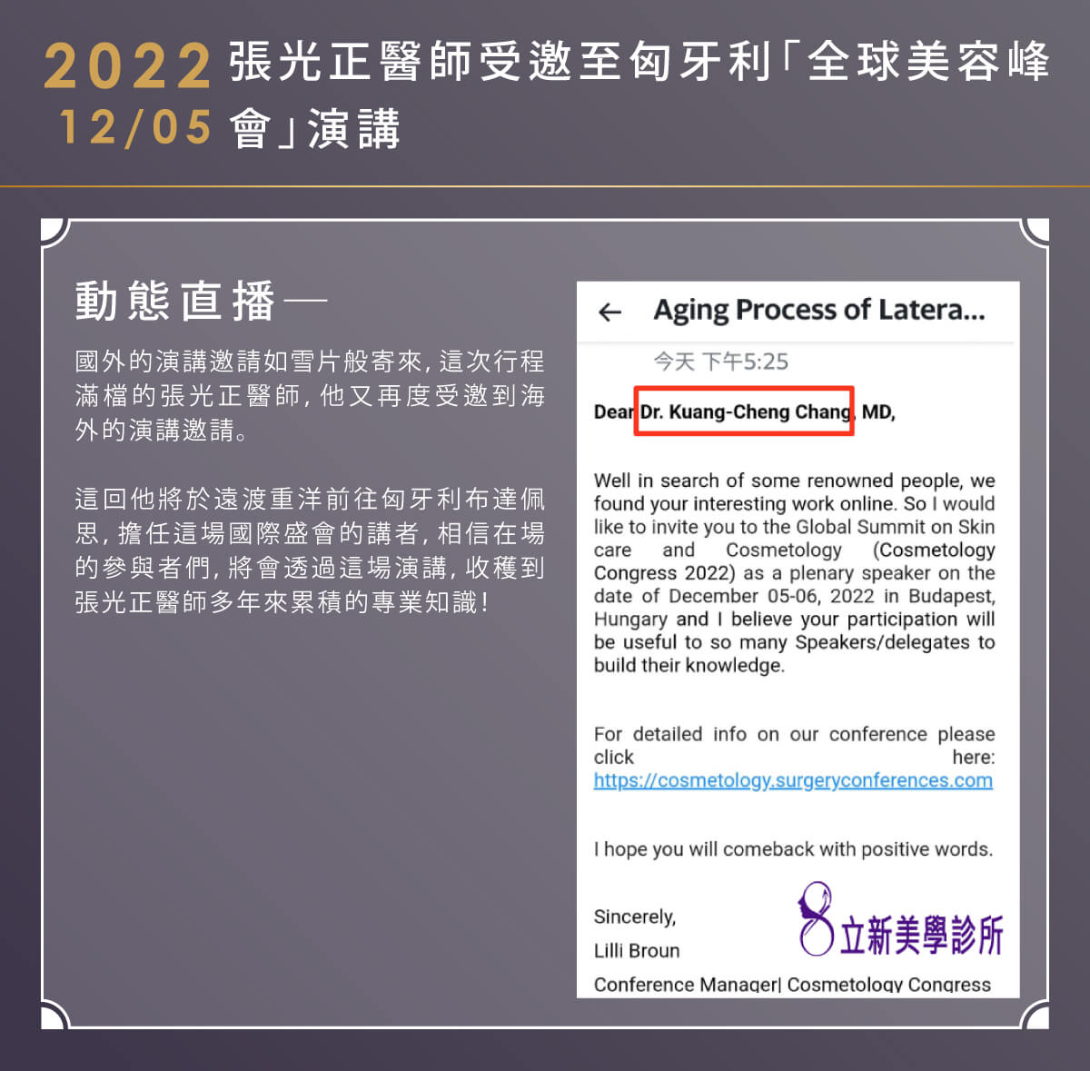 张光医师受邀至匈牙利「全球美容峰会」演讲