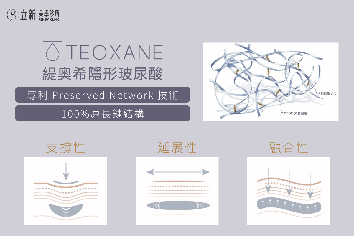 Teoxane开发划时代的Preserved Network专利技术,打破过去人造玻尿酸的限制,保留天然玻尿酸中的100%原长链结构,大大提升支撑力、延展性以及融合度。在抚平肌肤细纹,填补老态凹陷,重见年轻美肌的同时,不会出现硬块、颗粒等让人尴尬的窘境,皮肤触感柔软自然,让人爱不释手,同时也因为贴近人体天然玻尿酸,不只能融合肌肤、支撑与填补凹陷部位,还能更加融入肌肤,大幅降低不必要的成分,减少发炎和残留的疑虑。