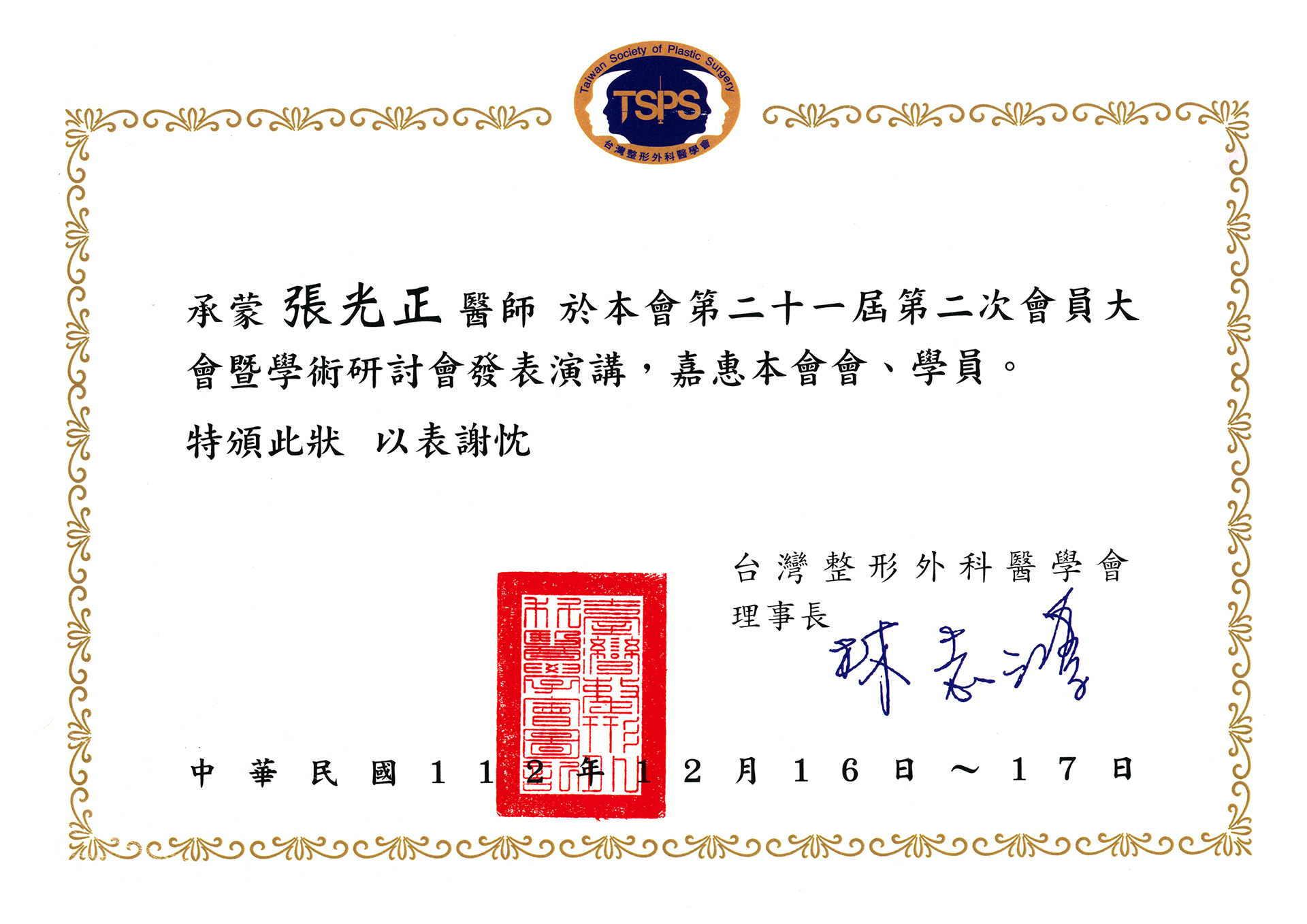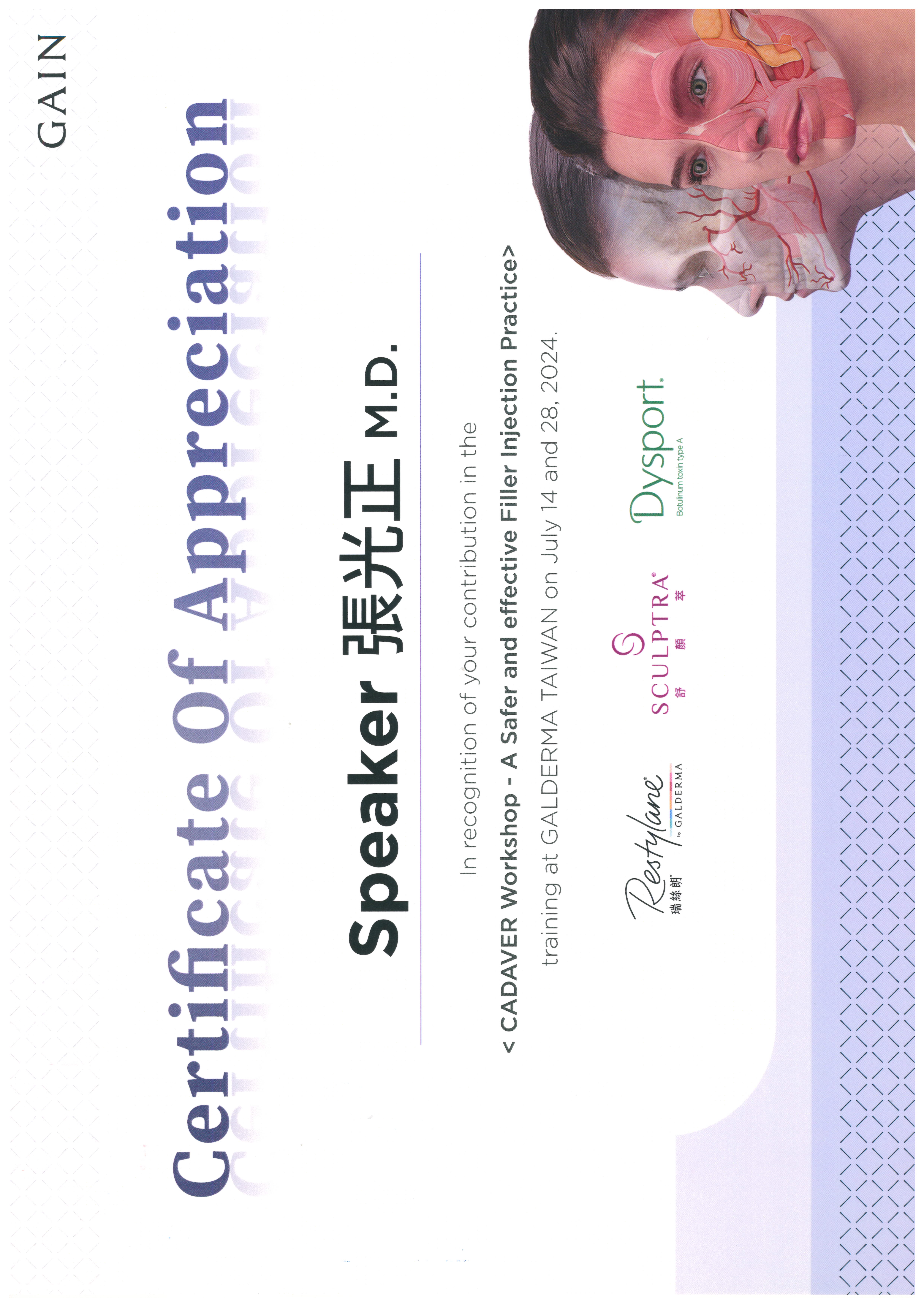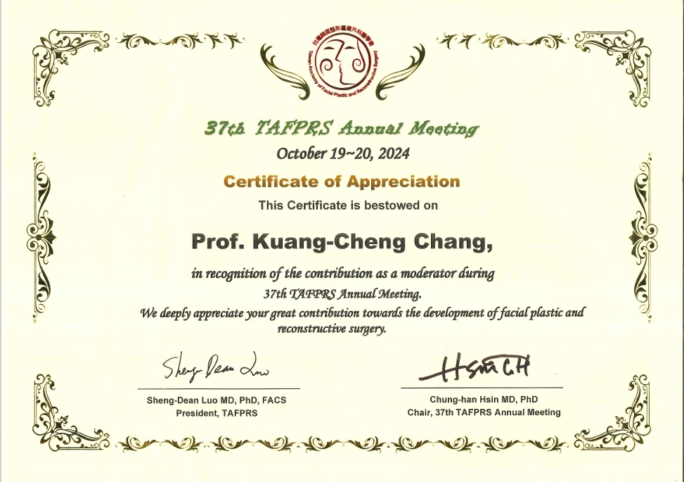 Extended deep plane rhytedectomy with minimal incision;BBF义大利世界拉皮大会;韩国颜面整形重建外科国际演讨会─授课讲师;各大医学会三层次拉皮演示暨教学;医美大师的淬链者拉皮讲座上额内视镜拉皮─座长;医学会颈部赫本耳后双向拉─深层脂肪转位下巴。