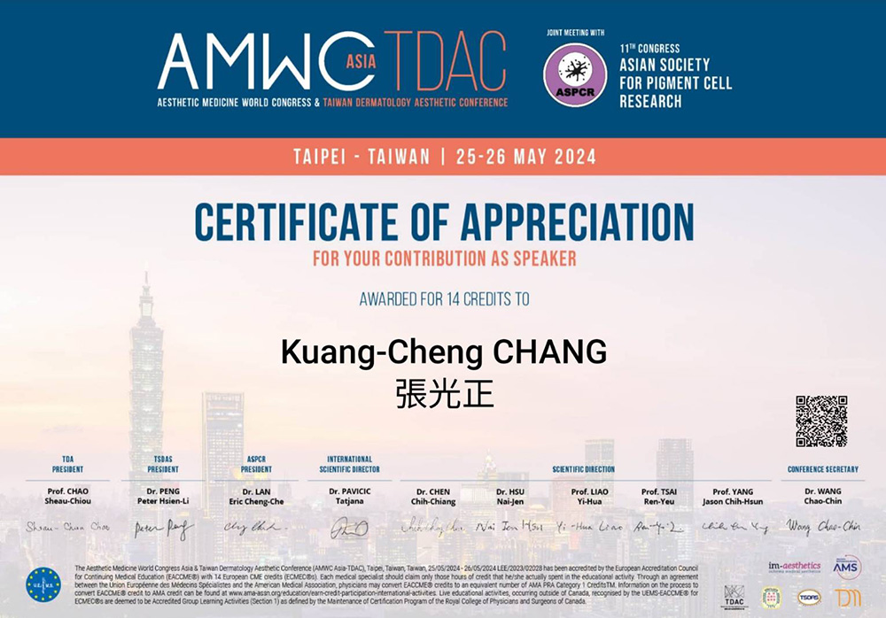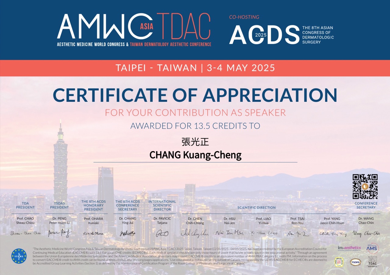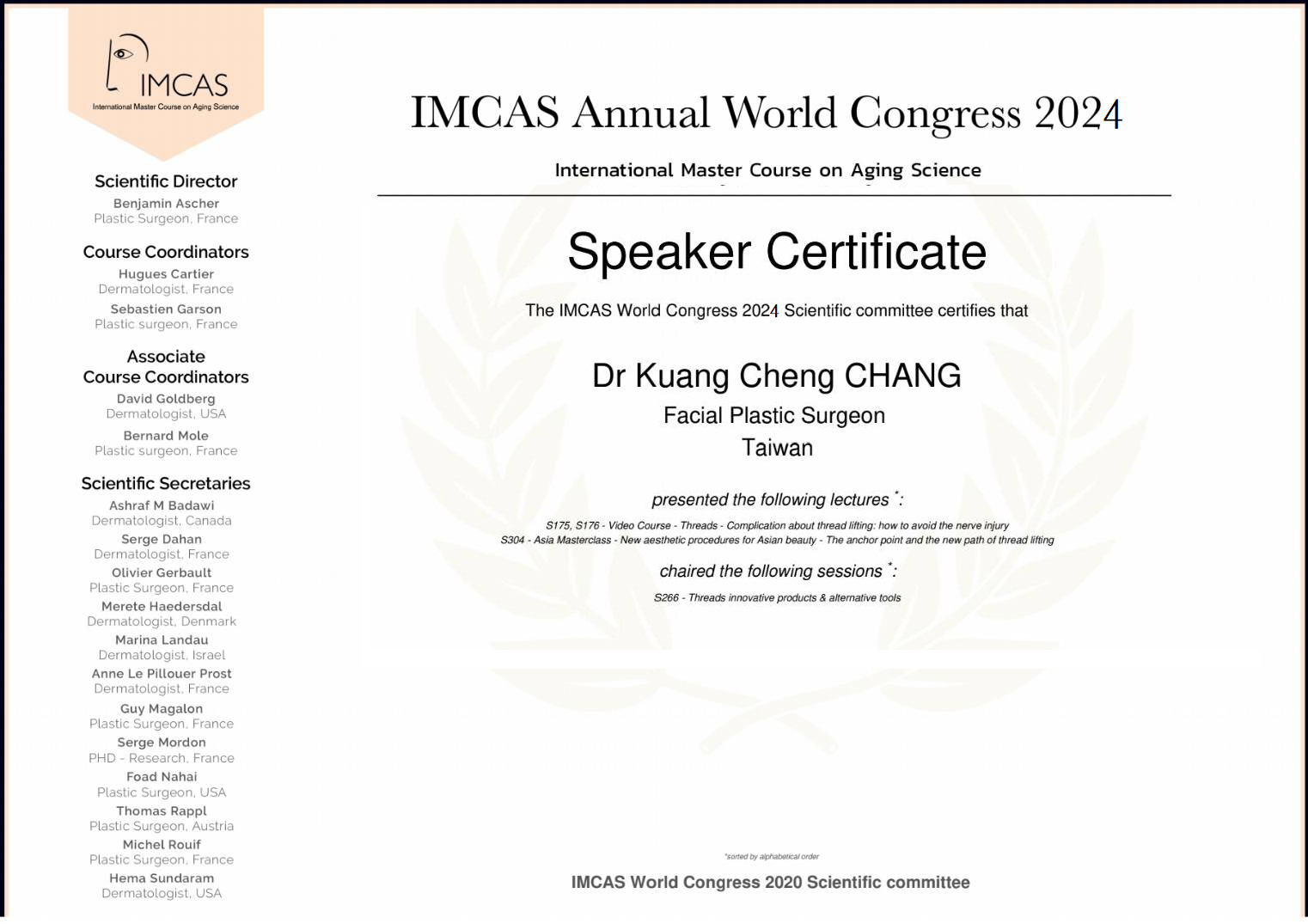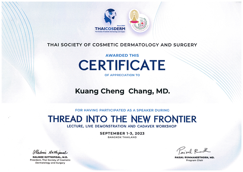 北京八大处悬吊线雕国际会议─台湾代表讲师、中国整形医师协会线技术分会台湾唯一理事、同时身兼多家线材邀请担任教师KOL─2022MINT KOL、2021提美拉线雕大赛评审、2019鱼骨讲师、2017大陆QUILL顾问医师,受邀至美国、巴黎、泰国、韩国邀请演讲独特线雕拉提技术、杭州面部年轻化手术演示会。