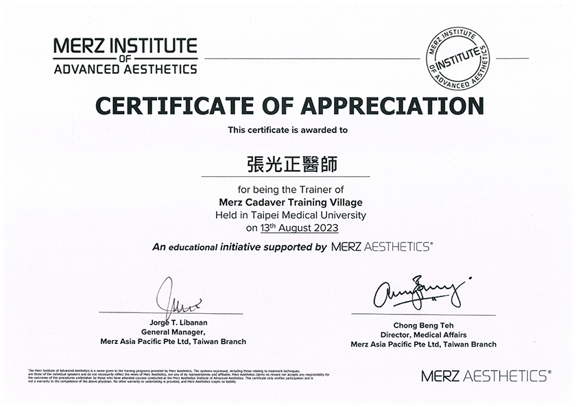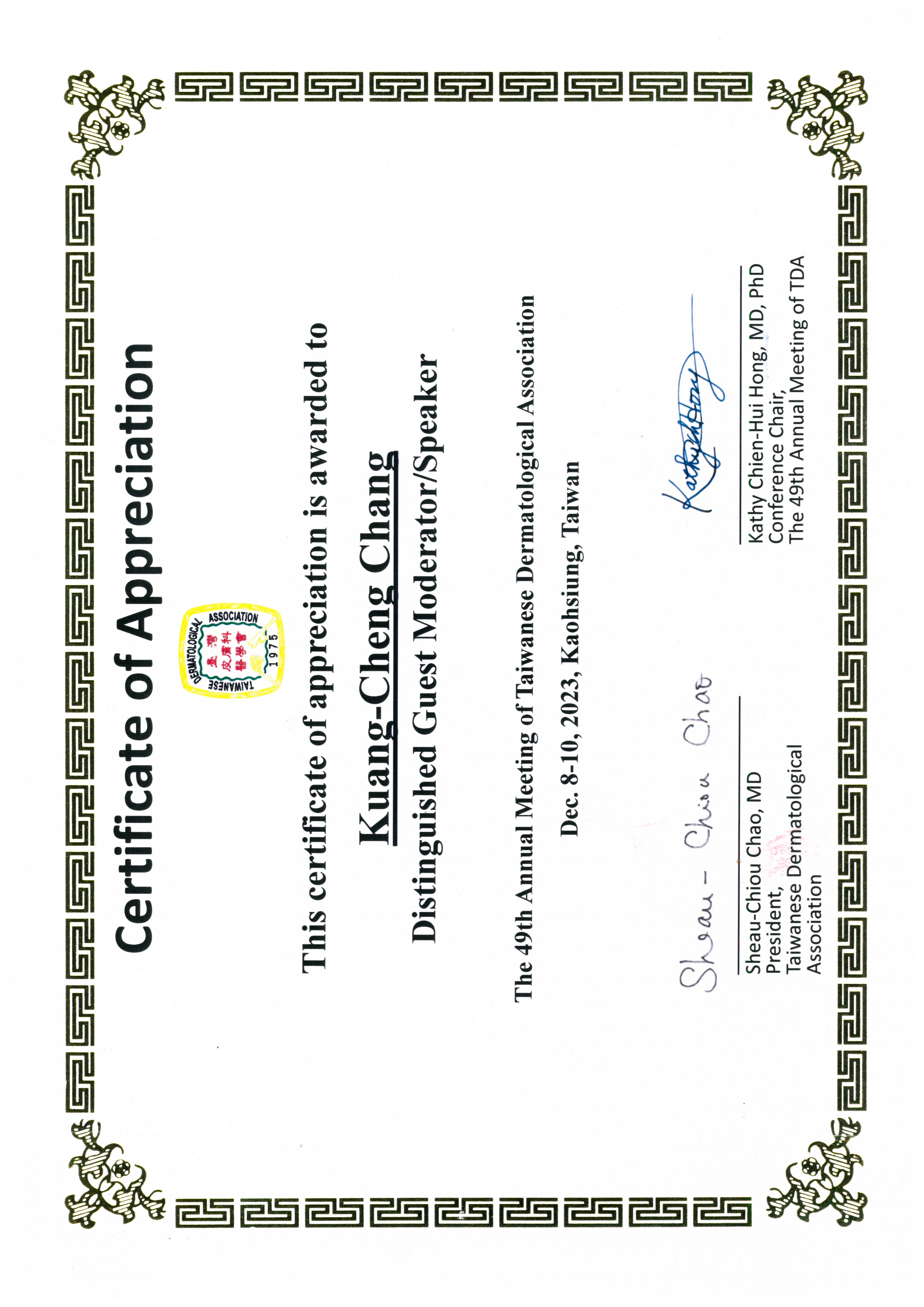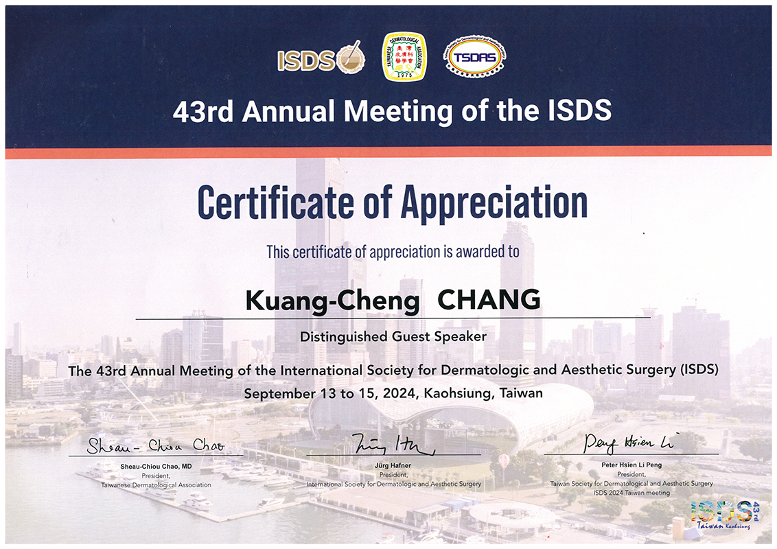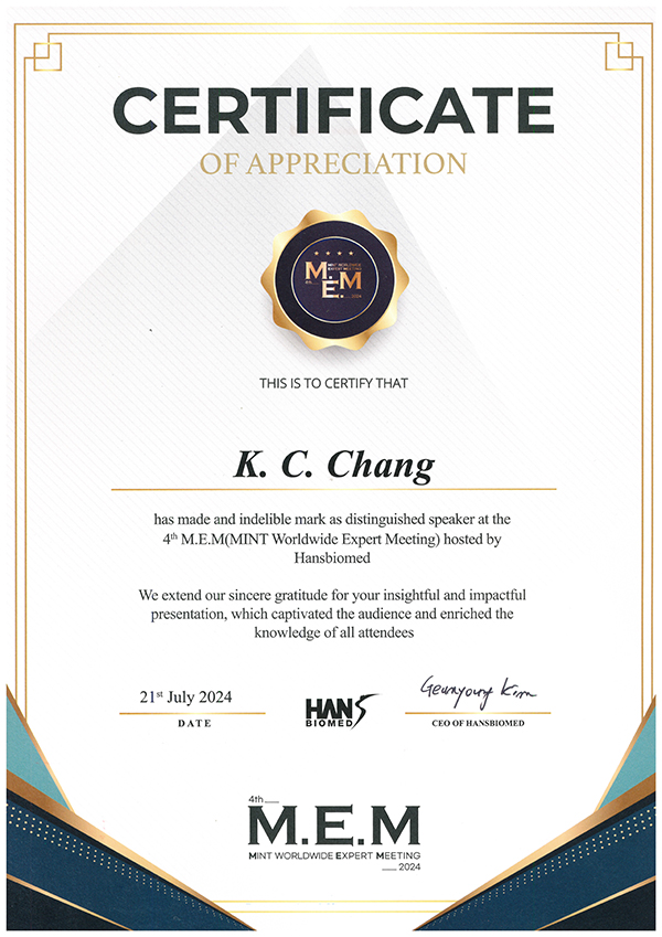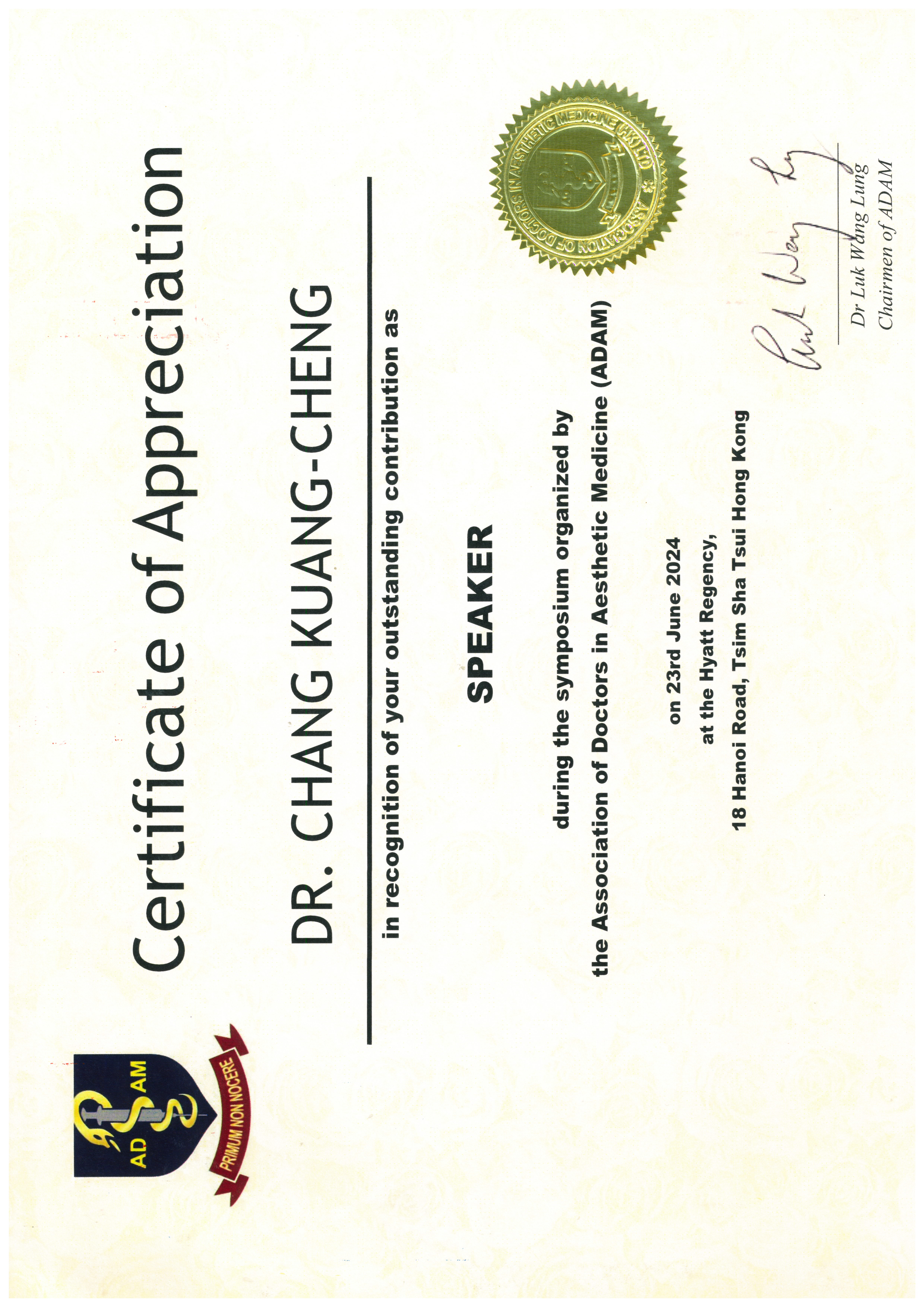 北京八大处悬吊线雕国际会议─台湾代表讲师、中国整形医师协会线技术分会台湾唯一理事、同时身兼多家线材邀请担任教师KOL─2022MINT KOL、2021提美拉线雕大赛评审、2019鱼骨讲师、2017大陆QUILL顾问医师,受邀至美国、巴黎、泰国、韩国邀请演讲独特线雕拉提技术、杭州面部年轻化手术演示会。